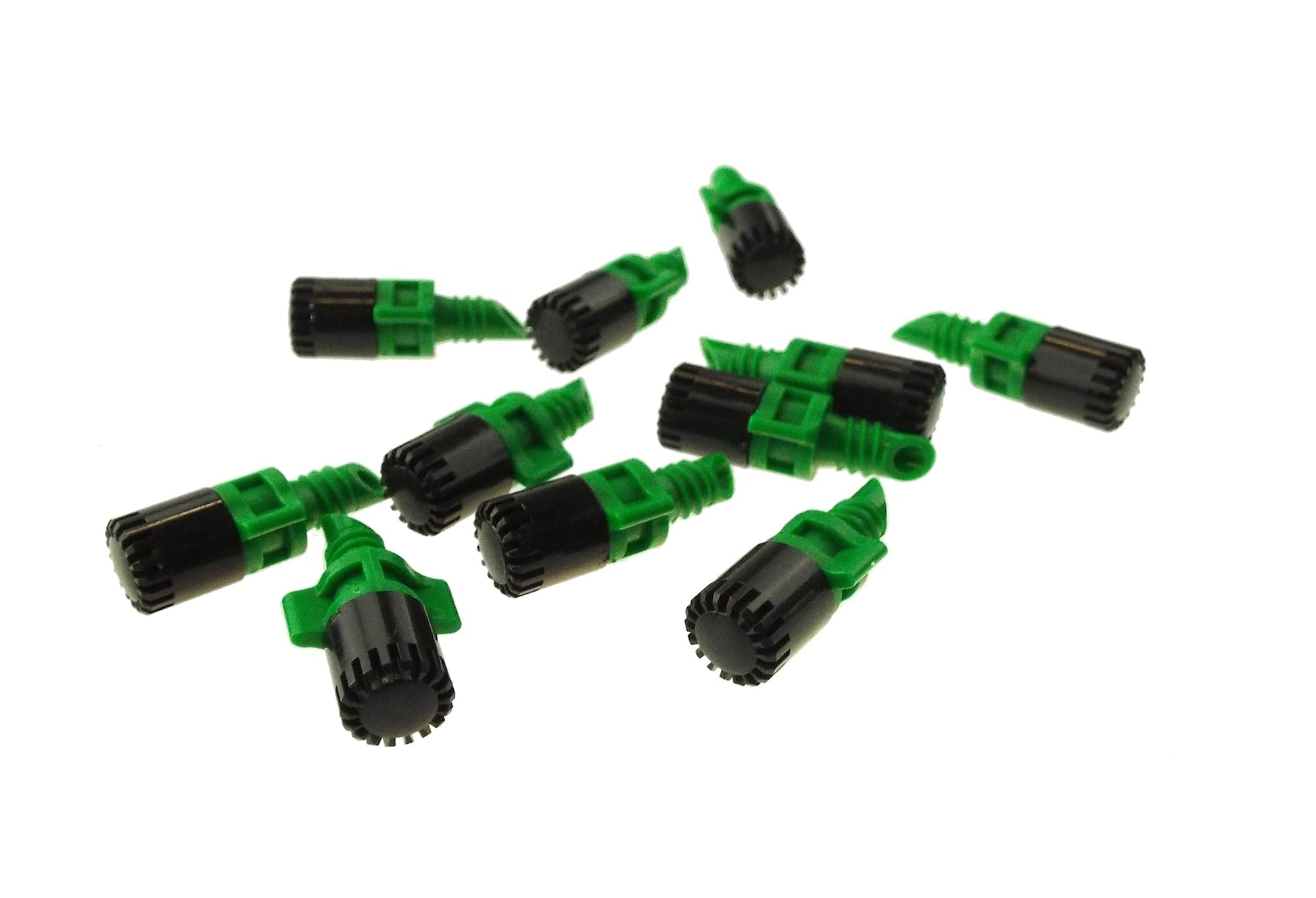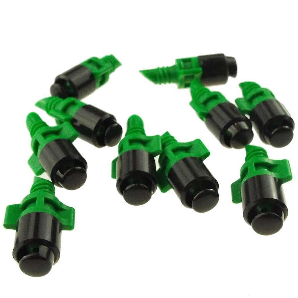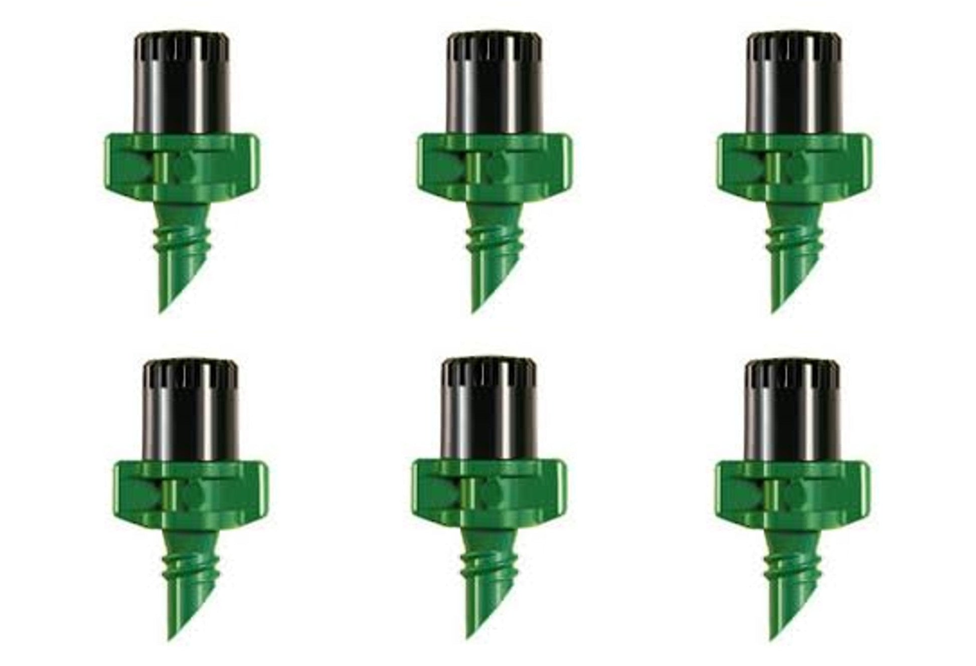 Presenting the Winged Micro Spray Jet — assembled with a black cap and green base, designed for precision and user-friendliness. This two-piece jet delivers a full 360° spray pattern, perfectly suited to a variety of garden watering requirements. Crafted with careful attention to detail, it provides consistent and accurate irrigation for landscaped areas, home gardens, nurseries, and horticultural settings.